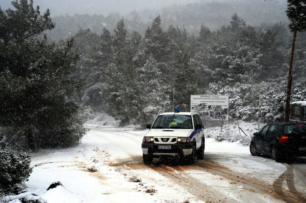 Η διακοπή κυκλοφορίας και στα δύο ρεύματα κυκλοφορίας στη Λεωφόρο Πάρνηθος ισχύει από το ύψος του τελεφερίκ και μετά, λόγω του χιονιού που έχει πέσει και καθιστά αδύνατη τη μετακίνηση των οχημάτων.
