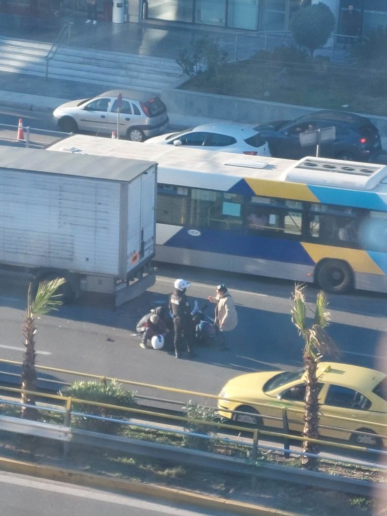 Τροχαίο ατύχημα με την εμπλοκή μηχανής της ομάδας ΔΙ.ΑΣ και φορτηγού έγινε το μεσημέρι της Τετάρτης στη Συγγρού.