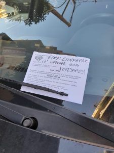 «Φίλε οδηγέ, Παρακαλούμε να σταθμεύεις το όχημα σου έτσι ώστε να μη δημιουργείται πρόβλημα στη διέλευση των απορριμματοφόρων για τη σωστή αποκομιδή των απορριμμάτων». Στο σημείωμα υπήρξε άμεσα… απάντηση, η οποία έλεγε: