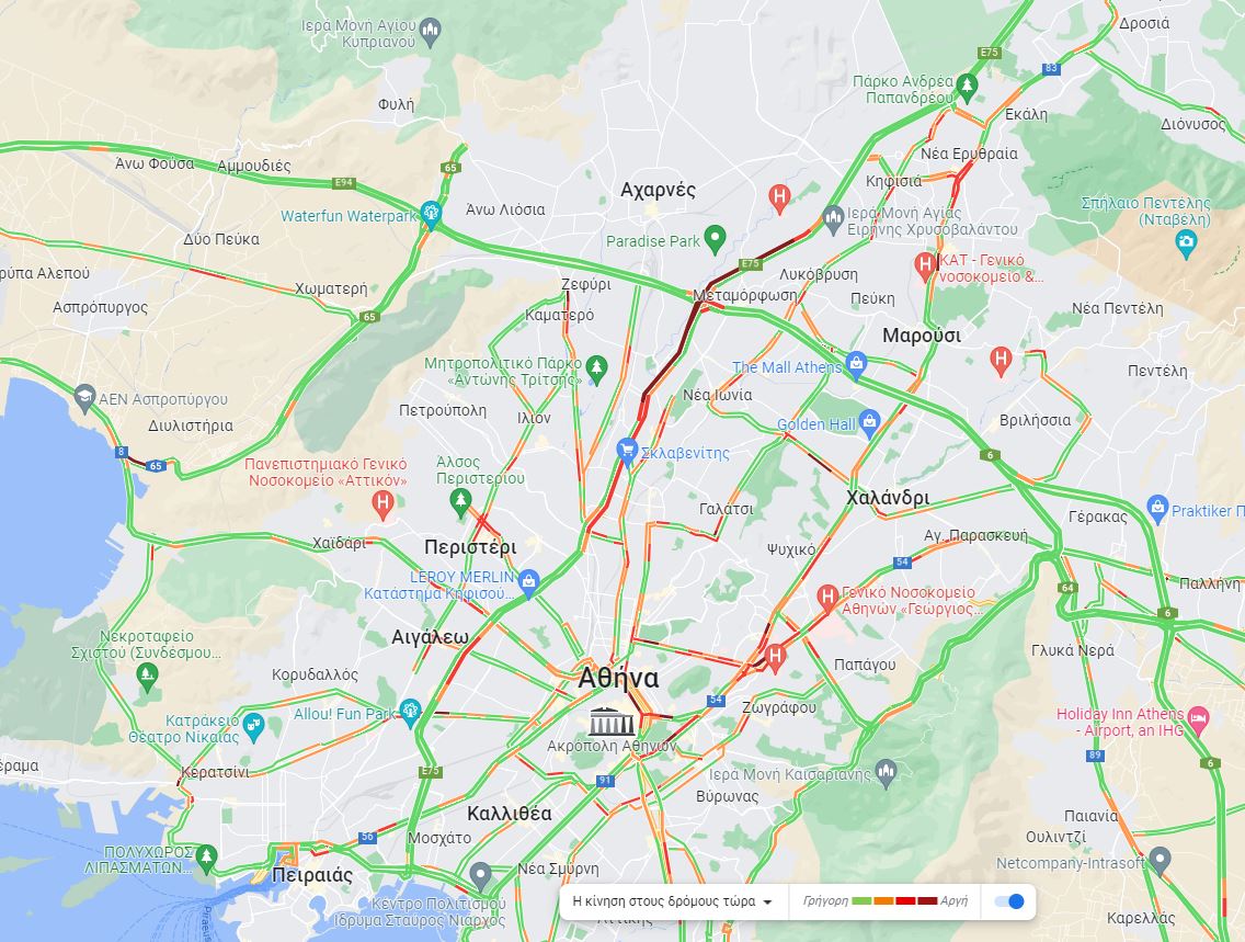 Ο σχετικός χάρτης της κυκλοφορίας, αποτυπώνει πλήρως την κατάσταση που επικρατεί αυτή την ώρα στους δρόμους.