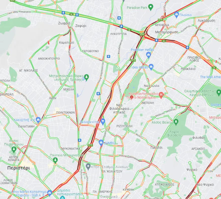 Στην άνοδο, στο ύψος του Περιστερίου τα αυτοκίνητα κινούνται με μεγάλες καθυστερήσεις, ενώ στην κάθοδο, στο ύψος της Μεταμόρφωσης υπάρχει μποτιλιάρισμα, με τα οχήματα να είναι ακινητοποιημένα. Ανάλογη εικόνα και στο ένα ρεύμα της Αττικής Οδού στο ίδιο ύψος.