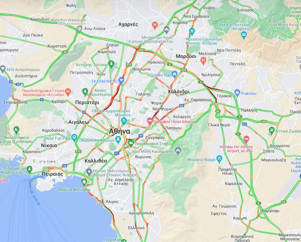 Επίσης, αυξημένη είναι η κίνηση και στη Λεωφόρο Κηφισίας, τη Λεωφόρο Αθηνών (στο ύψος του Σκαραμαγκά), τη Μεσογείων, την Κατεχάκη, την Παραλιακή αλλά και την Αττική Οδό.