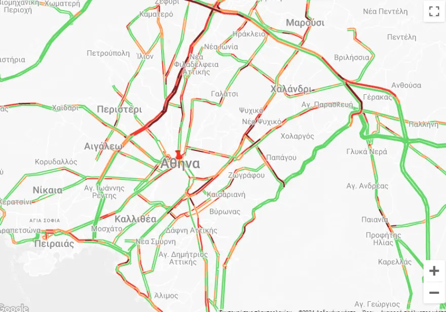 Στο «κόκκινο» είναι η κίνηση που καταγράφεται το πρωί της Τρίτης (2/4) στους κεντρικούς οδικούς άξονες της Αττικής.