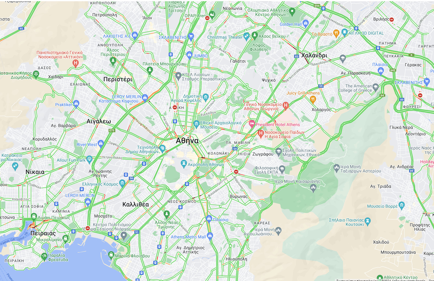 Παρακάτω φαίνεται ο χάρτης, ο οποίος δείχνει την κίνηση στους δρόμους του Λεκανοπεδίου Αττικής.