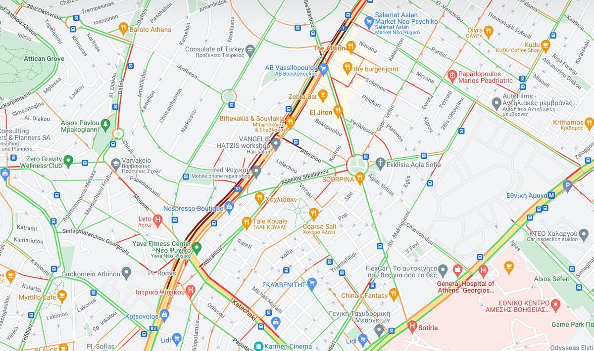 Στη άνοδο του Κηφισού από τον κόμβο της Μεταμόρφωσης προς το Περιστέρι και στα δύο ρεύματα.