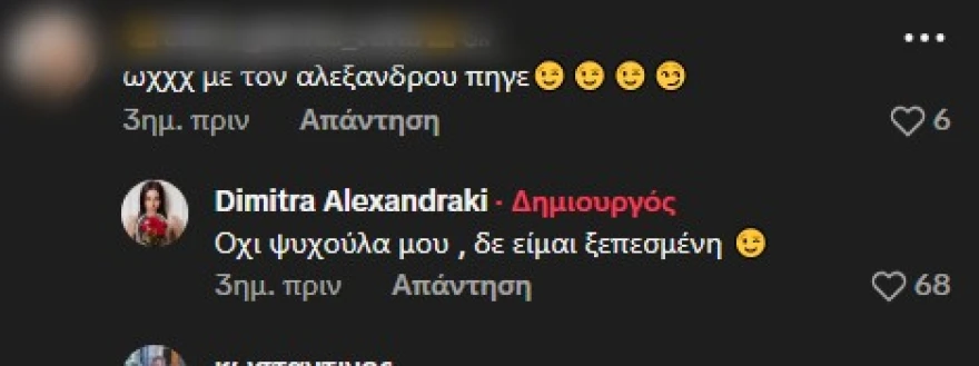Σε βίντεο που δημοσίευσε η Δήμητρα Αλεξανδράκη από παραλία του Άμπου Ντάμπι, ένας ακόλουθός της έγραψε: «Οχ, με τον Αλεξάνδρου πήγε» με εκείνη όχι μόνο να διαψεύδει το κοινό ταξίδι τους, αλλά να αφήνει και αιχμές για το πρόσωπό του. «Όχι ψυχούλα μου, δεν είμαι ξεπεσμένη», απάντησε.