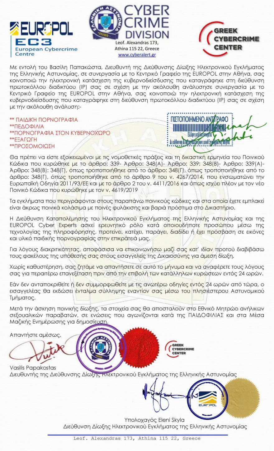 Μάλιστα, στην προσπάθειά τους να προσδώσουν «αληθοφάνεια» στη σχετική επιστολή χρησιμοποιούν τα λογότυπα της Ελληνικής Αστυνομίας και της Europol και εντύπωμα στρογγυλής σφραγίδας με δήθεν υπογραφή του Διευθυντή της Διεύθυνσης Δίωξης Ηλεκτρονικού Εγκλήματος.