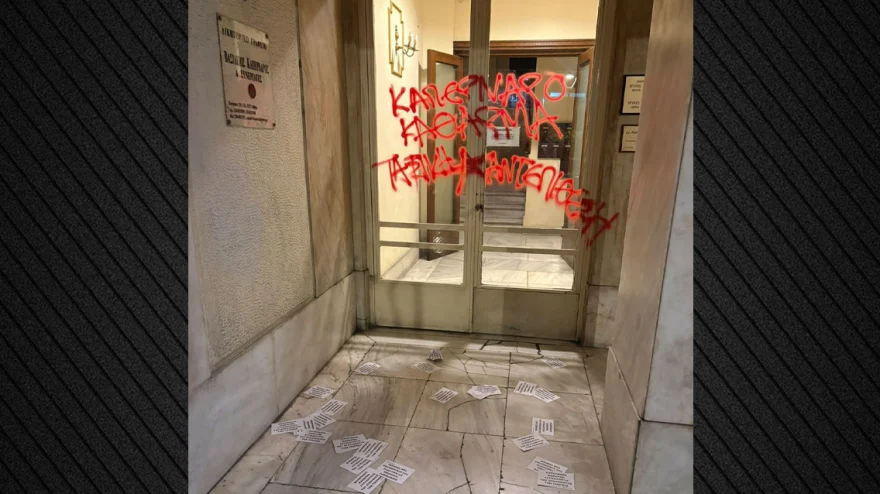 Σύμφωνα με πληροφορίες, οι εμπλεκόμενοι έγραψαν με κόκκινη μπογιά ένα σύνθημα στην πολυκατοικία όπου στεγάζεται το γραφείο του δικηγόρου, πέταξαν τρικάκια και αποχώρησαν.