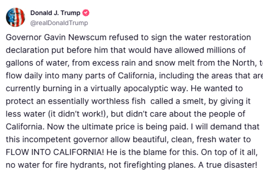 Αυτή η καταστροφική πολιτική επιλογή είναι που άφησε την Καλιφόρνια χωρίς νερό για τις πυροσβεστικές ανάγκες. «Μια πραγματική καταστροφή!», όπως έγραψε ο Τραμπ στην Truth Social.