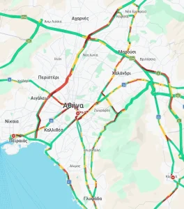 Όπως φαίνεται και στον παρακάτω χάρτη, στο «κόκκινο» είναι ο Κηφισός, η Λεωφόρος Αθηνών, η Αλίμου Κατεχάκη στο ρεύμα προς Καρέα, η Ποσειδώνος, στο ύψος του Ελληνικού, η εθνική οδός πριν τον κόμβο Μεταμόρφωσης και η Αττική οδός, στο ρεύμα προς Ελευσίνα.