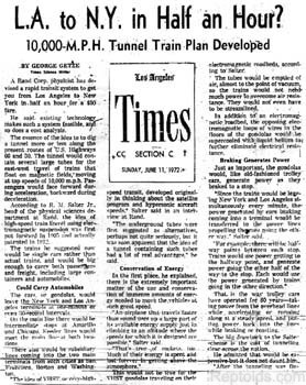 Άρθρο που δημοσιεύτηκε στη εφημερίδα Los Angeles Times στις 11 Ιουνίου 1972. “Ταχύτητες έως και 10.000 μίλια την ώρα έχουν εξεταστεί σε μελέτες από την εταιρεία RAND – σε μια περίπτωση για παράδειγμα μια απευθείας υπόγεια σύνδεση μεταξύ του Λος Άντζελες και της Νέας Υόρκης θα απαιτούσε μόνο 21 λεπτά ταξιδιού!”