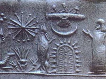 Επάνω από τα κεφάλια τους υπάρχουν μερικά σύμβολα. Το τρίτο στα δεξιά είναι ο πσίγνωστος «φτερωτός ήλιος», ή σύμβολο του Νιμπίρου.