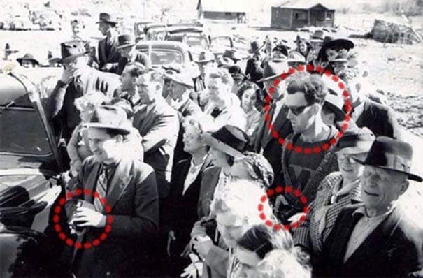 Σημειωμένος με κόκκινο κύκλο, ο άντρας εμφανίζεται να φορά γυαλιά ηλίου και ρουχισμό που δεν ήταν διαθέσιμος στις αρχές της δεκαετίας του ’40(!), ενώ και η φωτογραφική μηχανή που κρατά δεν κυκλοφόρησε παρά δεκαετίες αργότερα! Οι διαξιφισμοί για την ερμηνεία του αλλόκοτου γεγονότος παραμένουν…