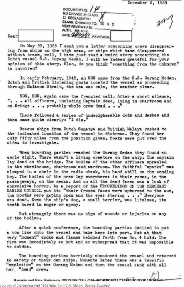 Είναι Φεβρουάριος του 1948 και πολλά καράβια που πλέουν στα ανοιχτά της Ινδονησίας λαμβάνουν επείγοντα σήματα κινδύνου από την ολλανδική φρεγάτα SS Ourang Medan. Το ανατριχιαστικό μήνυμα αναφέρει: «Όλοι οι αξιωματικοί και ο καπετάνιος είναι νεκροί πάνω στο κατάστρωμα και την γέφυρα. Πιθανότατα όλο το πλήρωμα είναι νεκρό». Στην συνέχεια, λαμβάνονται ακατάληπτα σήματα μορς και τελικά μία λέξη: «Πεθαίνω».