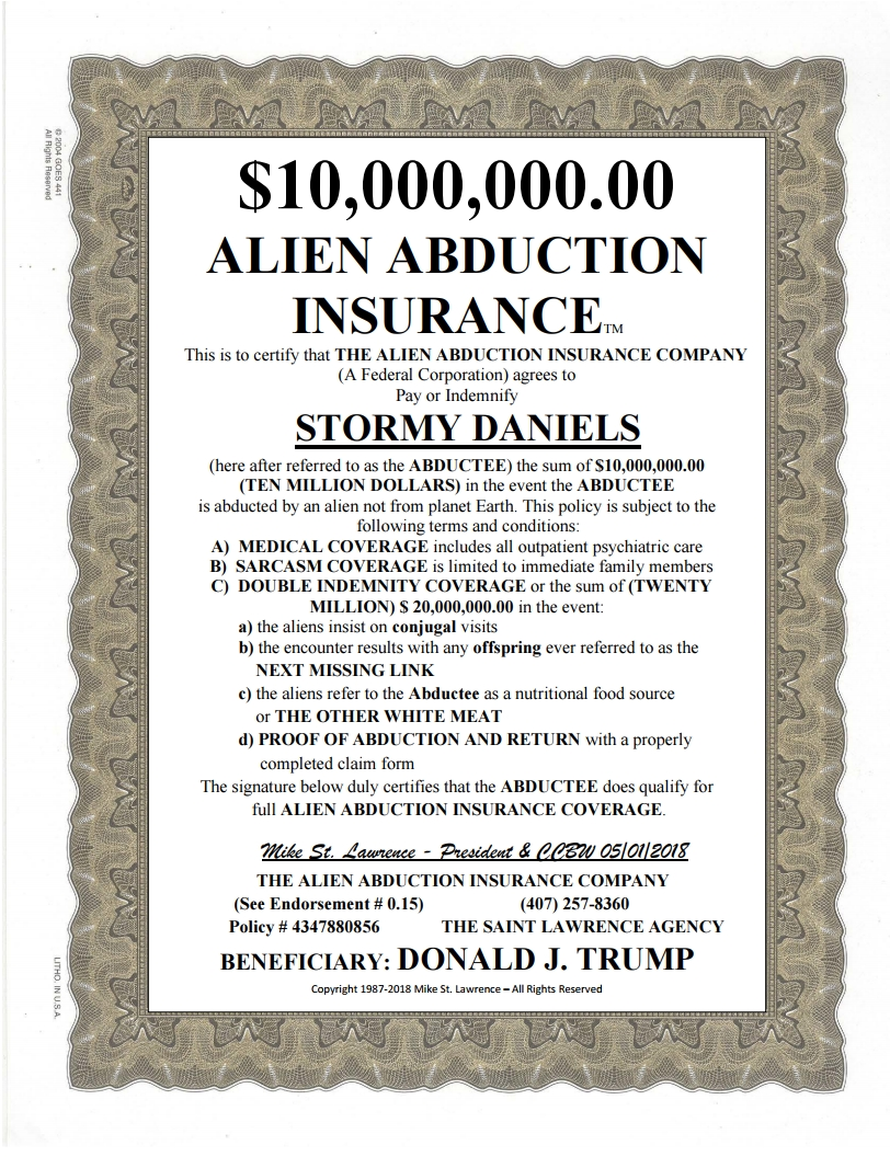 Ο Mike St Lawrence έχει γραφείο στο Altamonte Springs όπου μεταξύ άλλων προσφέρει ένα έγγραφο με το οποίο πιστοποιεί πως θα αποζημιώσει όποιον μπει στο στόχαστρο των εξωγήινων με 10 εκατομμύρια δολάρια.