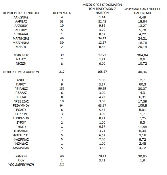 Ακόμα, το Ρέθυμνο καταγράφει 94 κρούσματα, ενώ η Λάρισα 53, η Αχαΐα 49 και τα Ιωάννινα 48.