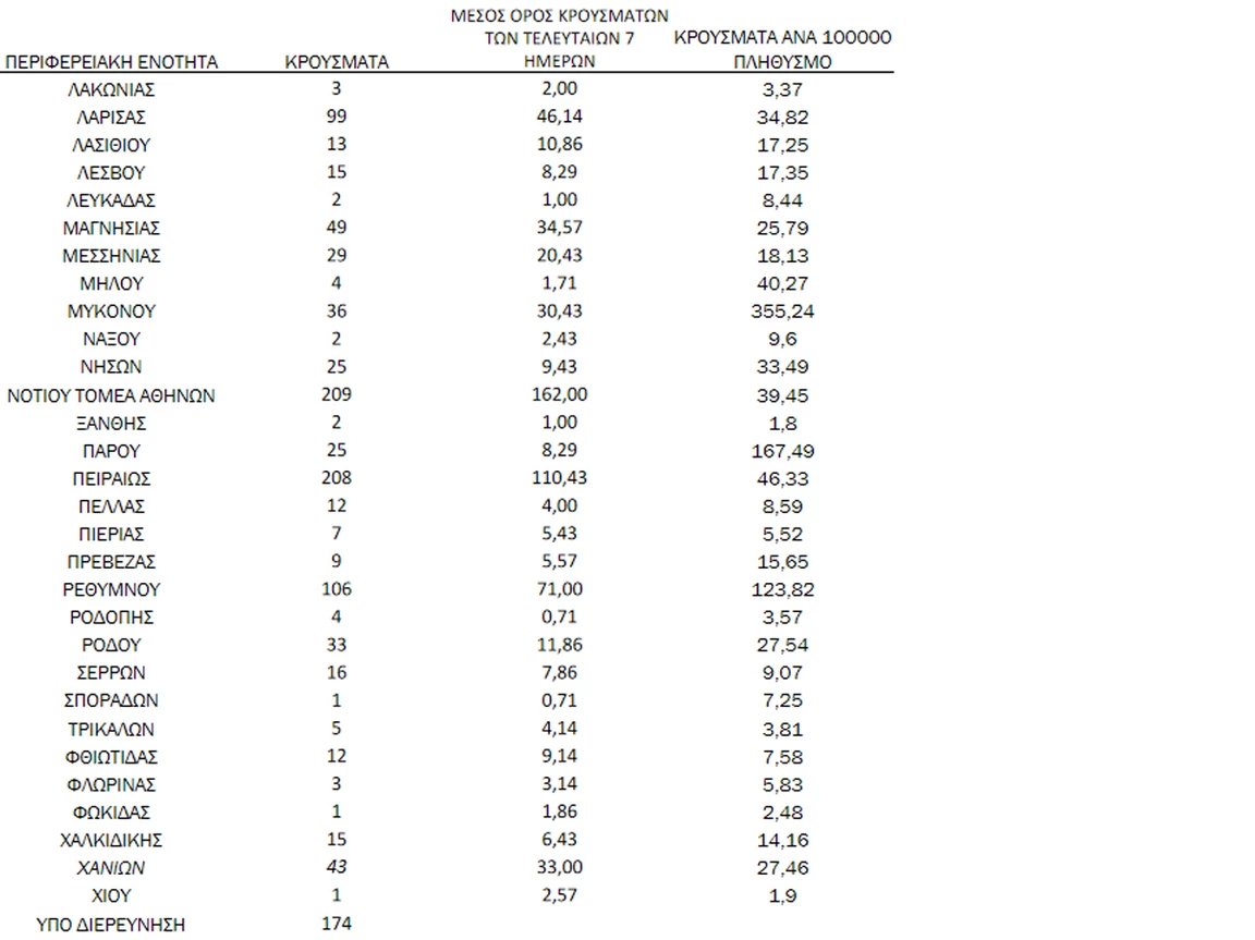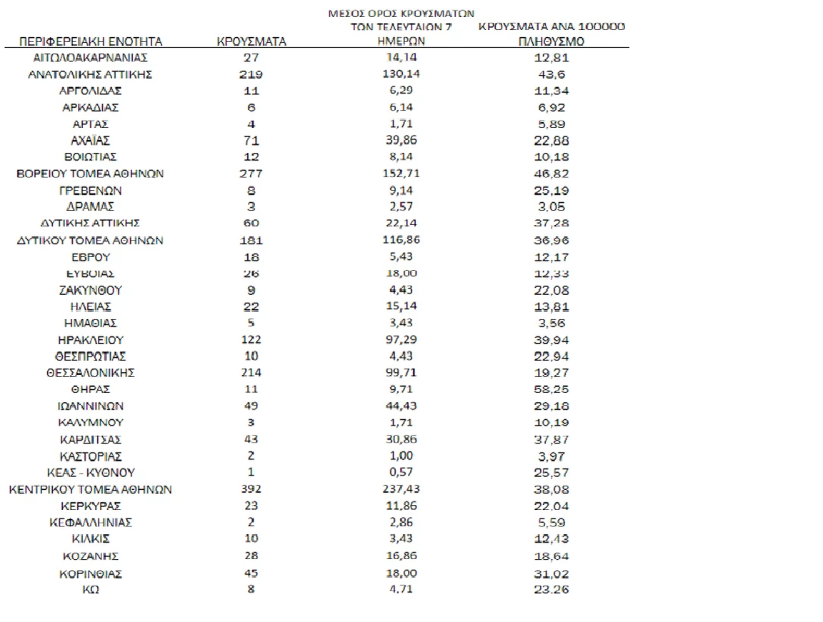 Συγκεκριμένα η Αττική έχει 1.571 νέα κρούσματα κορονοϊού, με το κέντρο της Αθήνας να καταγράφει 392 νέα περιστατικά covid-19.