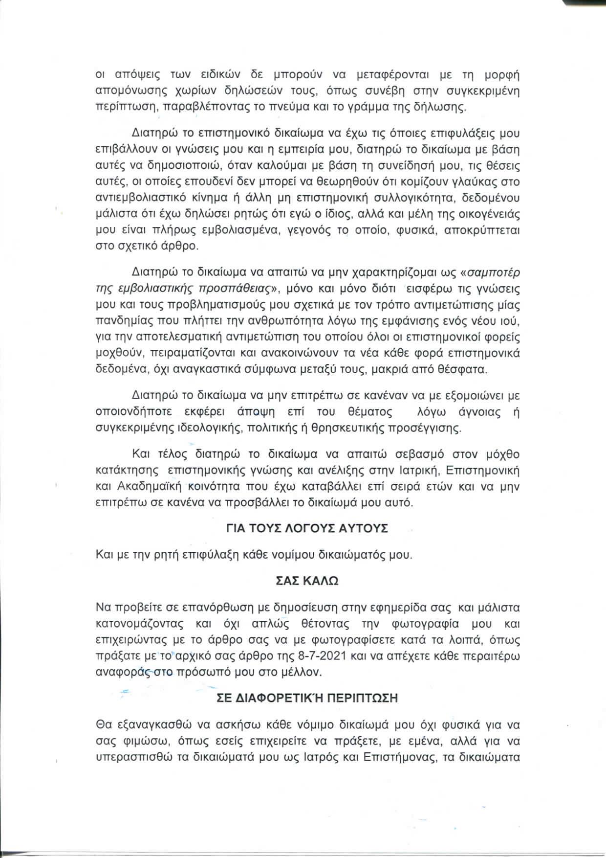 Με μια οργισμένη εξώδικη δήλωση απαντά ο καθηγητής Φαρμακολογίας & Κλινικής Φαρμακολογίας, Διευθυντής του Εργαστηρίου Κλινικής Φαρμακολογίας του Αριστοτελείου Πανεπιστημίου Θεσσαλονίκης Δημήτρης Κούβελας σε δημοσιεύματα στα οποία αποκαλείται ως «κρατικά χρηματοδοτούμενος αντιεμβολιαστής».