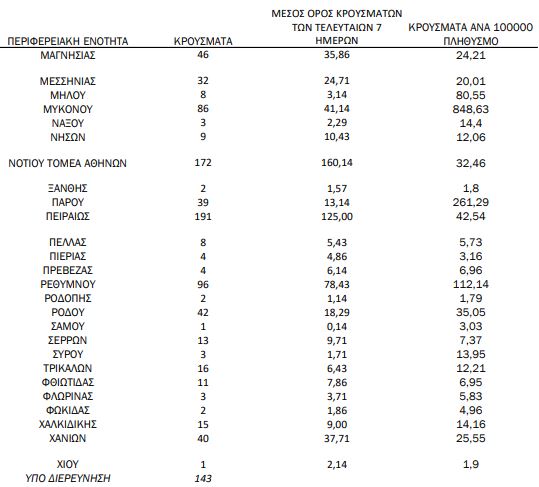 Ο ΕΟΔΥ γνωστοποίησε ακόμη την γεωγραφική κατανομή των κρουσμάτων ανά περιφέρεια, με την Αττική να σημειώνει 1190 νέες μολύνσεις.