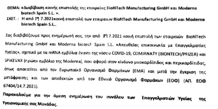 Τώρα, και μετά από εκατομμύρια δόσεις των εν λόγω εμβολίων, ο Ευρωπαϊκός Οργανισμός Φαρμάκων κατέληξε στο συμπέρασμα ότι «υφίσταται τουλάχιστον εύλογη πιθανότητα αιτιώδους συσχέτισης» μεταξύ των δύο εμβολίων κατά του κορωνοϊού τεχνολογίας mRNA και της μυοκαρδίτιδας και περικαρδίτιδας. Δηλαδή των εμβολίων Pfizer και Moderna.