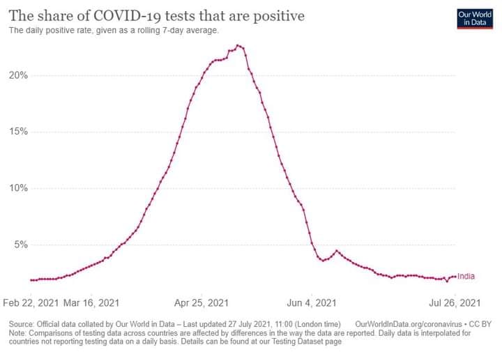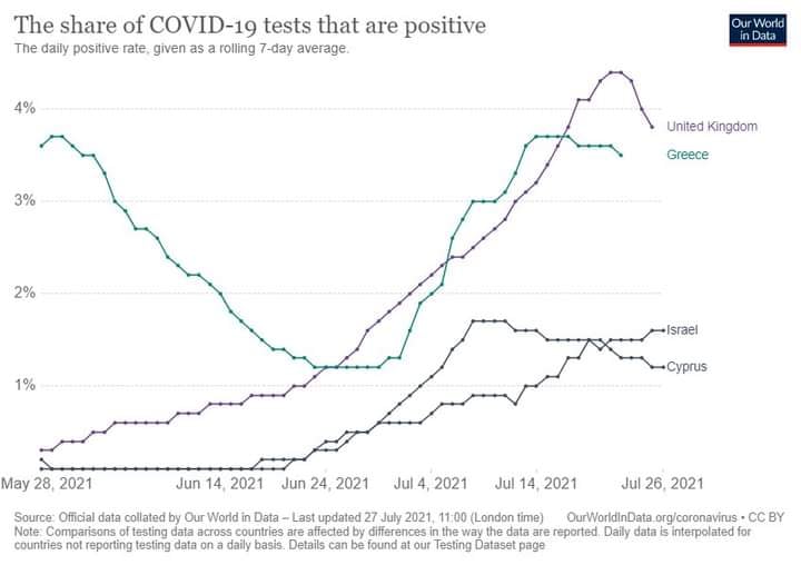 «Αφιερωμένο σε όσους προβλέπουν 10.000 «κρούσματα» στα μέσα Αυγούστου! Μελετώντας προσεκτικά τον δείκτη θετικότητας των διαγνωστικών τεστ στο OUR WORLD IN DATA, στην Ινδία όπου ξεκίνησε η μετάλλαξη δ, η αύξηση των μολύνσεων άρχισε στις αρχές Μαρτίου, έφθασε στην κορύφωσή του σε δύο μήνες δηλαδή στις αρχές Μαίου. Στην Μεγάλη Βρεττανία το πανδημικό κύμα άρχισε στο τέλος Μαίου και δύο μήνες μετά δηλαδή σήμερα έχει αρχίσει να κάμπτεται αφού φαίνεται να έφθασε στην κορύφωσή του. Λόγω των εμβολιασμών η ένταση του κύματος ήταν σαφώς ηπιότερη. Φαίνεται ότι και άλλες χώρες όπως το Ισραήλ, ή Κύπρος που προηγήθηκαν της χώρας μας σε αυτό το πανδημικό κύμα έφθασαν ήδη στην κορυφή αυτού του κύματος. Έστω και τώρα αντί του απόλυτου αριθμού των»κρουσμάτων» ας αξιοποιήσουμε τον δείκτη θετικότητας για την μελέτη της πορεία της πανδημίας . Θα βοηθήσει να αποφύγουμε σενάρια τρόμου και πανικού».