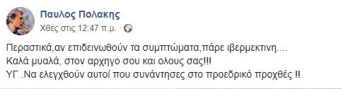 Συγκεκριμένα, ο κ. Βασιλακόπουλος ρωτήθηκε σε τηλεοπτική εκπομπή για την ιβερμεκτίνη, την οποία ο Παύλος Πολάκης σύστησε προς τον Αδωνι Γεωργιάδη, αν επιδεινωθούν τα συμπτώματα.