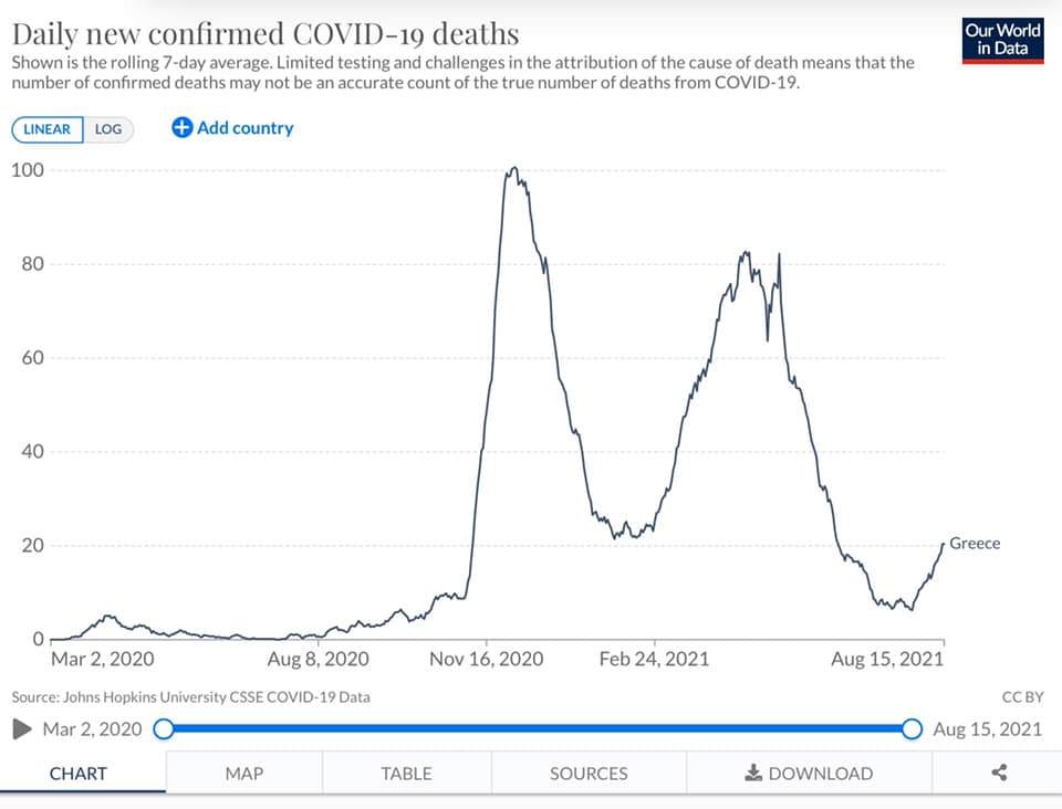 Επιβεβαιώνω ότι οι στατιστικές καμπύλες από το Our World in Data δείχνουν, με σαφήνεια, το γεγονός ότι στην παρούσα έξαρση των κρουσμάτων της Δέλτα, οι θάνατοι παραμένουν δυσαναλόγως χαμηλοί.