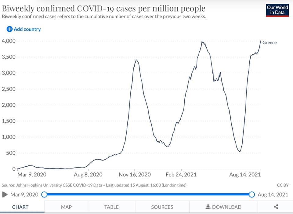 Επιβεβαιώνω ότι οι στατιστικές καμπύλες από το Our World in Data δείχνουν, με σαφήνεια, το γεγονός ότι στην παρούσα έξαρση των κρουσμάτων της Δέλτα, οι θάνατοι παραμένουν δυσαναλόγως χαμηλοί.
