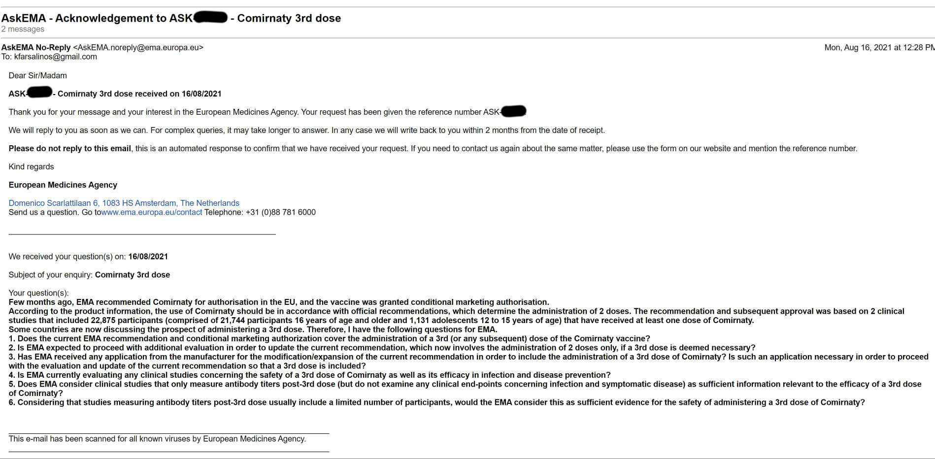 Παράλληλα καταγγέλλει πως στις 16 Αυγούστου έστειλε στον ΕΜΑ 6 ερωτήματα σχετικά με την 3η δόση. Ερωτήματα για την επέκταση της άδειας για 3η δόση (που δεν υπάρχει αυτή τη στιγμή), και για τα κριτήρια και δεδομένα ασφάλειας και αποτελεσματικότητας (που είναι ελλιπή, πρακτικά ανύπαρκτα).