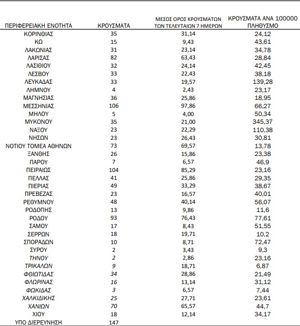 Με βάση τα επιβεβαιωμένα κρούσματα των τελευταίων 7 ημερών, 192 θεωρούνται σχετιζόμενα με ταξίδι από το εξωτερικό και 1.912 είναι σχετιζόμενα με ήδη γνωστό κρούσμα.