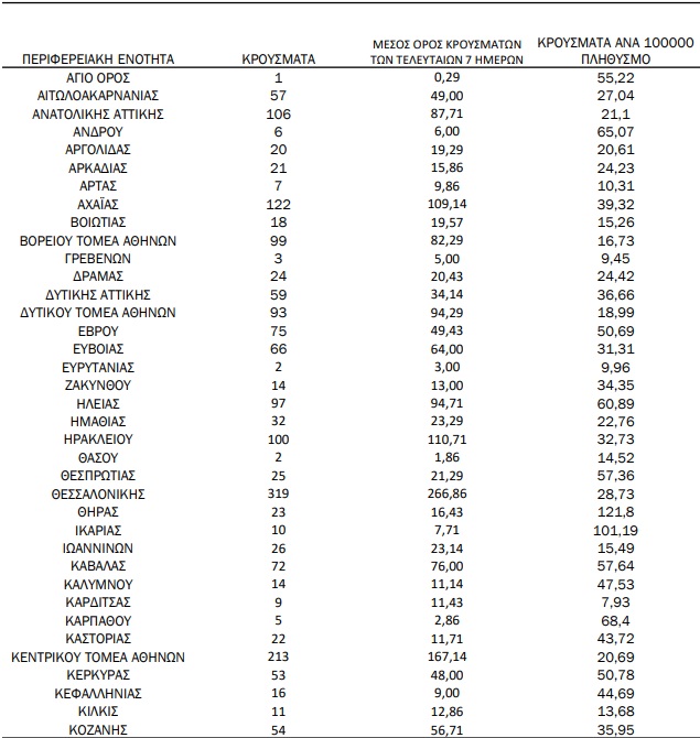 Με βάση τα επιβεβαιωμένα κρούσματα των τελευταίων 7 ημερών, 192 θεωρούνται σχετιζόμενα με ταξίδι από το εξωτερικό και 1.912 είναι σχετιζόμενα με ήδη γνωστό κρούσμα.