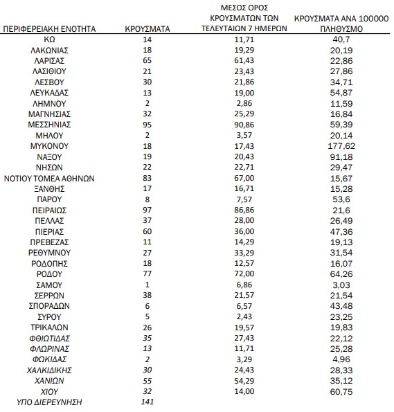 Με βάση τα επιβεβαιωμένα κρούσματα των τελευταίων 7 ημερών, 217 θεωρούνται σχετιζόμενα με ταξίδι από το εξωτερικό και 1.794 είναι σχετιζόμενα με ήδη γνωστό κρούσμα.