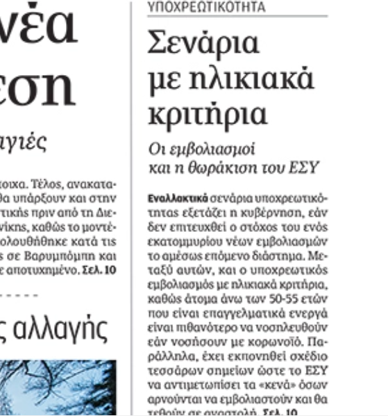 Σύμφωνα με το πρωτοσέλιδο της «Καθημερινής της Κυριακής», στην κυβέρνηση δεν αποκλείουν το ενδεχόμενο να επιβληθεί υποχρεωτικός εμβολιασμός ανάλογα με την…ηλικία!