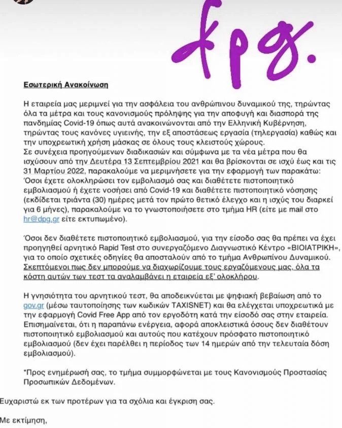 Η επίσημη ανακοίνωση μάλιστα είναι μέγα πράξη πατριωτισμού, καθώς η εταιρεία ξεκαθαρίζει ότι δεν πρόκειται να διαχωρίσει τους υπαλλήλους της «σε δύο κατηγορίες», κάτι που δεν διστάζει να κάνει η ίδια η ελληνική κυβέρνηση, με τις έμμεσες και άμεσες διώξεις κατά των μη εμβολιασμένων!