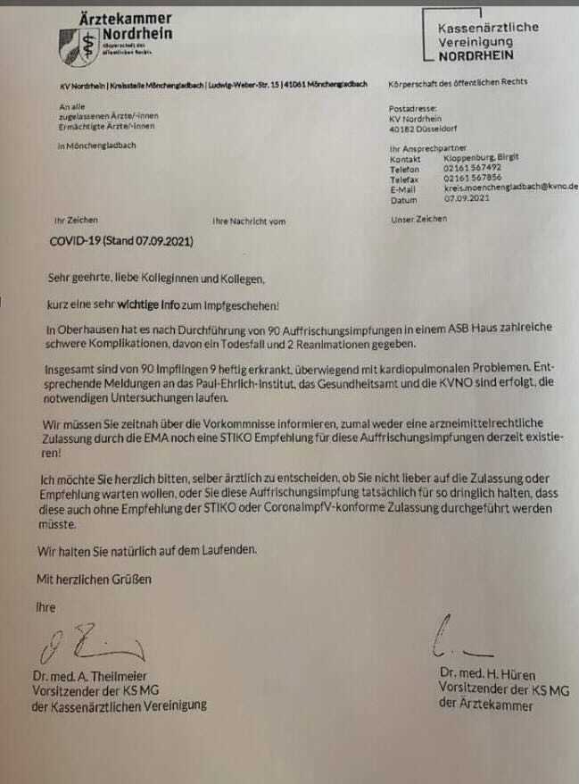 Με έγγραφο του ο Ιατρικός Σύλλογος του Nordreihn τονίζει πως σε 90 άτομα στα οποία χορηγήθηκε η 3η, ενισχυτική, δόση του εμβολίου κατά του κορωνοϊού το 10% εμφάνισε σοβαρές παρενέργειες, ενώ το ένα απ’ αυτά πέθανε!