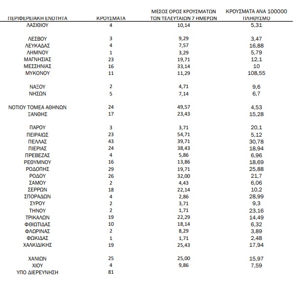 Με βάση τα επιβεβαιωμένα κρούσματα των τελευταίων 7 ημερών, 188 θεωρούνται σχετιζόμενα με ταξίδι από το εξωτερικό και 3.002 είναι σχετιζόμενα με ήδη γνωστό κρούσμα.