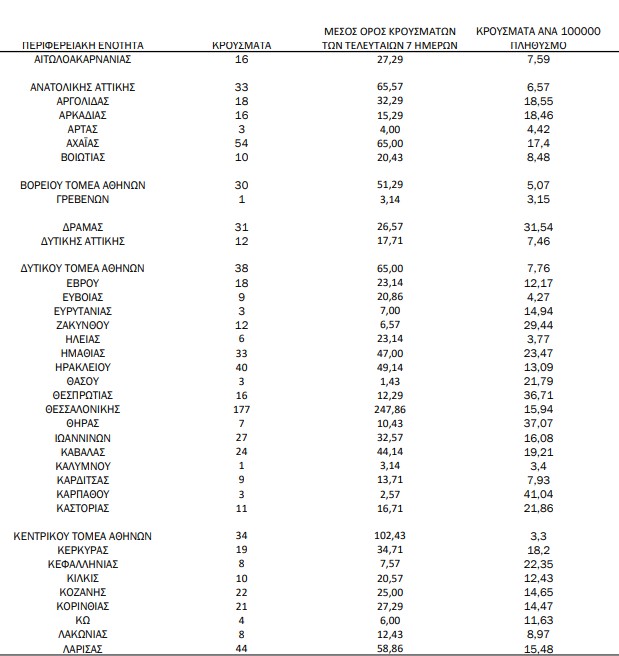 Με βάση τα επιβεβαιωμένα κρούσματα των τελευταίων 7 ημερών, 188 θεωρούνται σχετιζόμενα με ταξίδι από το εξωτερικό και 3.002 είναι σχετιζόμενα με ήδη γνωστό κρούσμα.