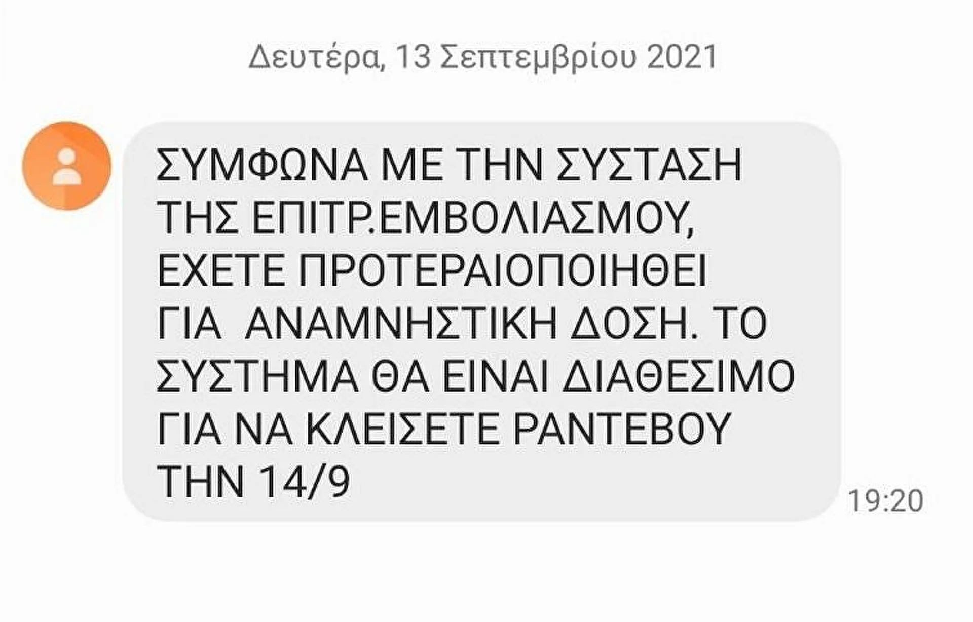 «Σύμφωνα με τη σύσταση της Επιτροπής Εμβολιασμού, έχετε προτεραιοποιηθεί για αναμνηστική δόση. Το σύστημα θα είναι διαθέσιμο για να κλείσετε ραντεβού την 14/9».