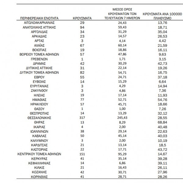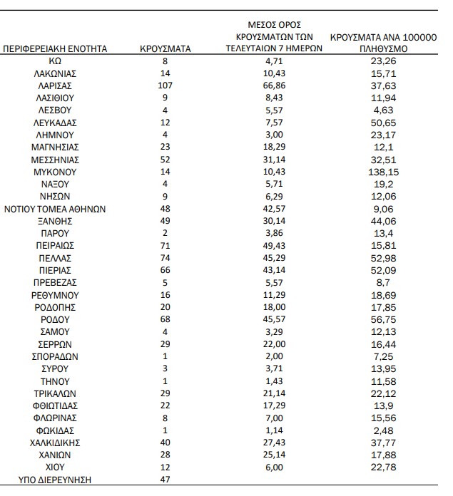 Με βάση τα επιβεβαιωμένα κρούσματα των τελευταίων 7 ημερών, 135 θεωρούνται σχετιζόμενα με ταξίδι από το εξωτερικό και 2.607 είναι σχετιζόμενα με ήδη γνωστό κρούσμα.