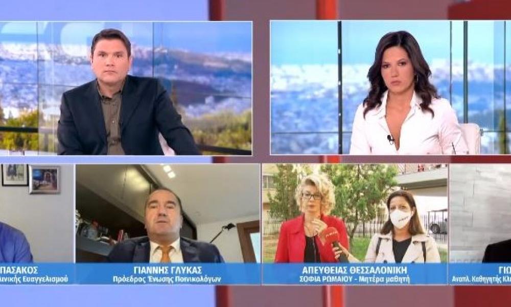 Η Σοφία Ρωμαίου, μητέρα από την Θεσσαλονίκη, η οποία δεν θέλει να φοράει το παιδί της μάσκα και να κάνει self test για να πάει στο σχολείο μιλά στην κάμερα τηλεοπτικής εκπομπής για τον εκβιασμό και τον εκφοβισμό που ασκούν στα παιδιά.