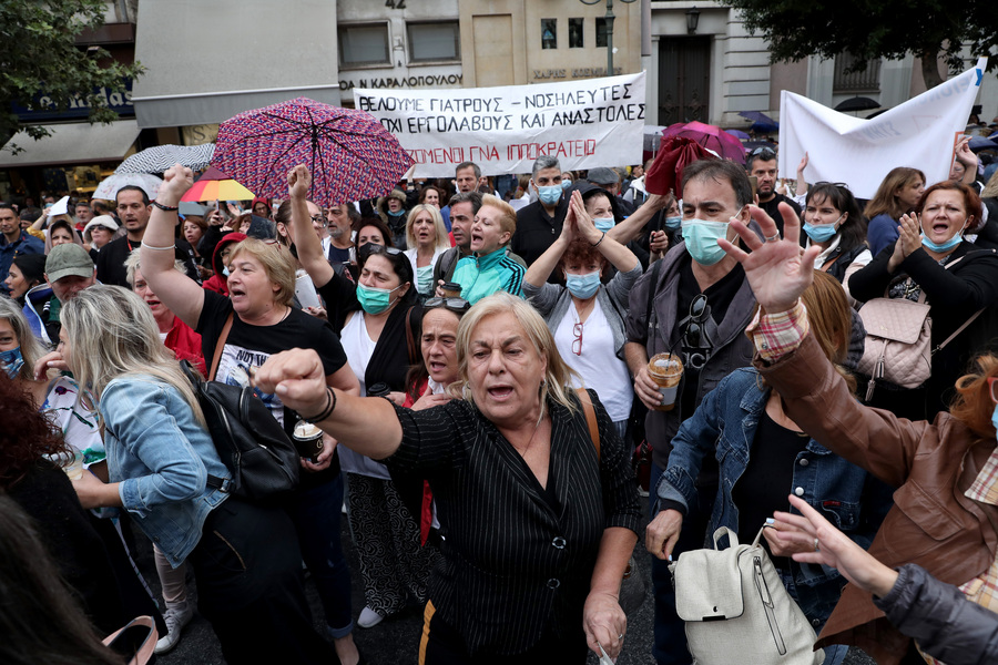 Μεγάλη συγκέντρωση διαμαρτυρίας κατά του υποχρεωτικού εμβολιασμού έξω από το Συμβούλιο της Επικρατείας πραγματοποίησαν το πρωί υγειονομικοί που έχουν τεθεί σε αναστολή εργασίας λόγω της άρνησής τους να εμβολιαστούν.