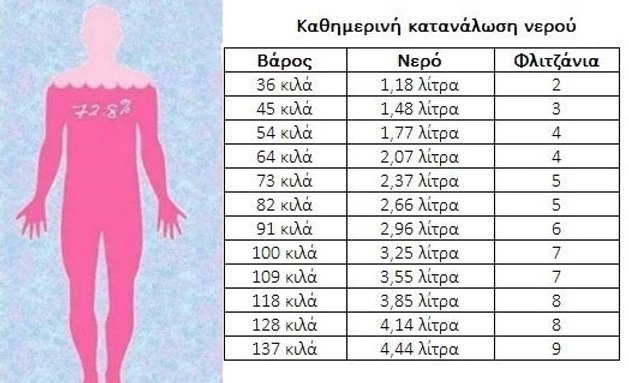 Αν και πολύ λίγοι το λαμβάνουν υπόψη, στην πραγματικότητα το βάρος του σώματος κάθε ατόμου συνδέεται με την ποσότητα νερού που πρέπει να καταναλώνει καθημερινά. Για παράδειγμα, ένα αδύνατο άτομο δεν χρειάζεται τόσο νερό όσο ένα βαρύτερο άτομο. Ωστόσο, επειδή ο καθένας έχει διαφορετικό σωματικό βάρος, υπάρχει ένας μαθηματικός τύπος που μπορεί να φανεί ιδιαίτερα χρήσιμος.