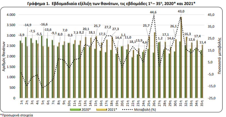 Όπως αναφέρει η ΕΛΣΤΑΤ σε 94.806 (48.149 άνδρες και 46.657 γυναίκες) ανήλθαν οι θάνατοι στην Ελλάδα τις 35 πρώτες εβδομάδες εφέτος (4/1/2021- 5/9/2021), ενώ κατά τις αντίστοιχες 35 εβδομάδες του 2020 (30/12/2019- 30/8/2020) είχαν ανέλθει σε 86.121 (43.038 άνδρες και 43.083 γυναίκες), σημειώνοντας αύξηση 10,08%. Παράλληλα, αύξηση κατά 10.925 θανάτους (13,02%) σημειώθηκε σε σχέση με το μέσο όρο των πρώτων 35 εβδομάδων της εξαετίας 2015- 2020 (83.881 θάνατοι).