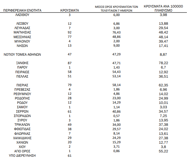 Με βάση τα επιβεβαιωμένα κρούσματα των τελευταίων 7 ημερών, 107 θεωρούνται σχετιζόμενα με ταξίδι από το εξωτερικό και 2.059 είναι σχετιζόμενα με ήδη γνωστό κρούσμα.