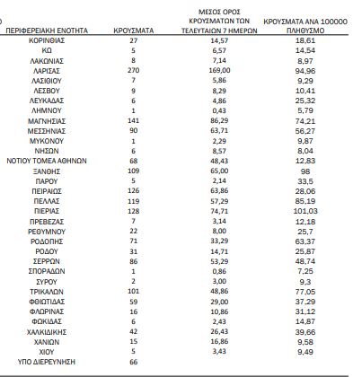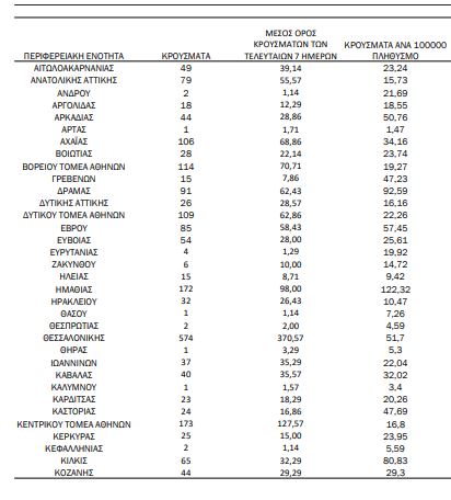 Ο ΕΟΔΥ γνωστοποίησε ακόμη για την κατανομή των κρουσμάτων ανά περιφέρεια, με την Αττική να σημειώνει 701 μολύνσεις και την Θεσσαλονίκη 574 αντίστοιχα.