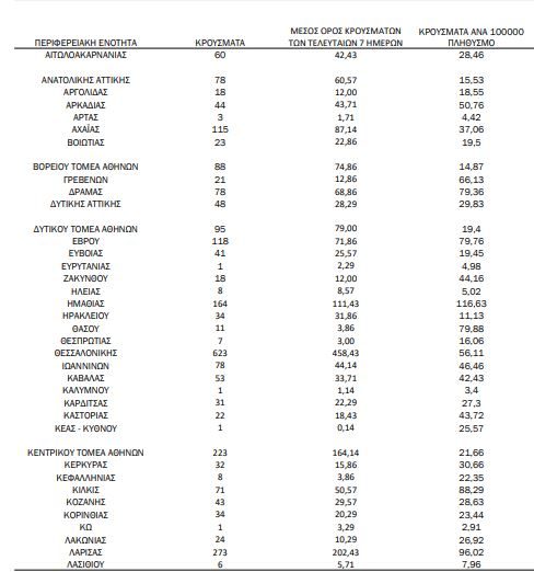 Ο συνολικός αριθμός των κρουσμάτων ανέρχεται σε 720.295 (ημερήσια μεταβολή +0.5%), εκ των οποίων 50.8% άνδρες. Με βάση τα επιβεβαιωμένα κρούσματα των τελευταίων 7 ημερών, 139 θεωρούνται σχετιζόμενα με ταξίδι από το εξωτερικό και 3.050 είναι σχετιζόμενα με ήδη γνωστό κρούσμα.