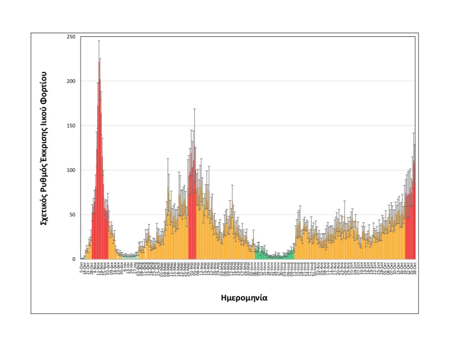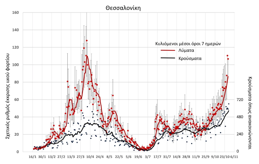 Συγκεκριμένα στα δείγματα που λαμβάνονται καθημερινά στην είσοδο της Εγκατάστασης Επεξεργασίας Λυμάτων Θεσσαλονίκης, αναφορικά με τις εξορθολογισμένες τιμές σχετικής έκκρισης ιικού φορτίου, η μέση τιμή των δύο πιο πρόσφατων μετρήσεων, δηλαδή της Τετάρτης 27/10 και της Πέμπτης 28/10 είναι: