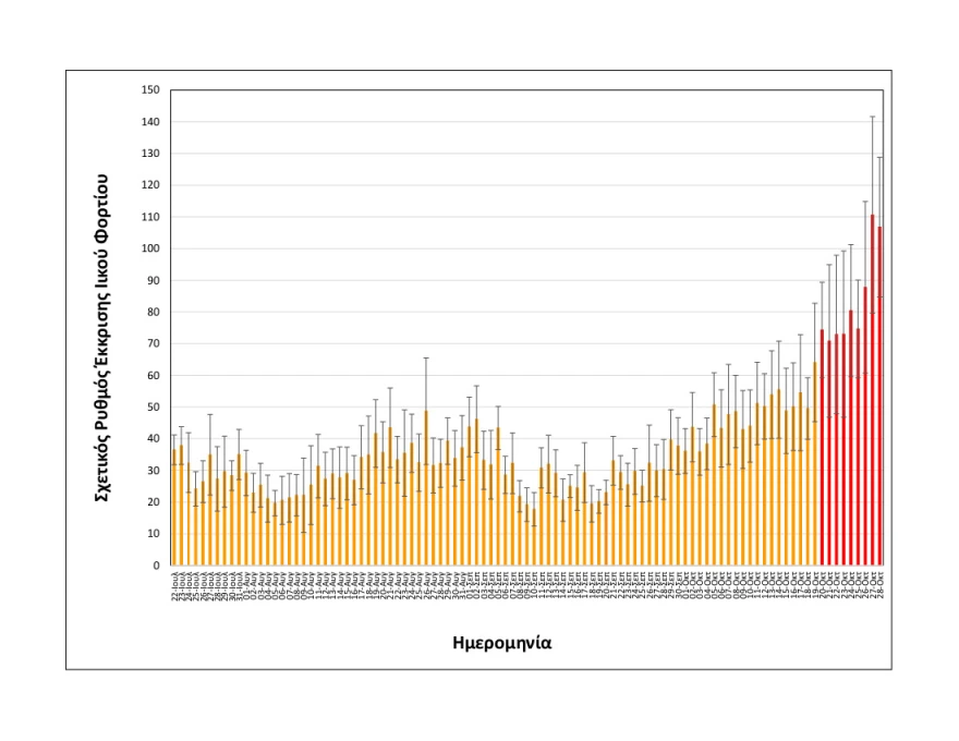 -Αυξημένη (+34%) σε σχέση με τη μέση τιμή των δύο αμέσως προηγούμενων μετρήσεων της Δευτέρας 25/10 και της Τρίτης 26/10.