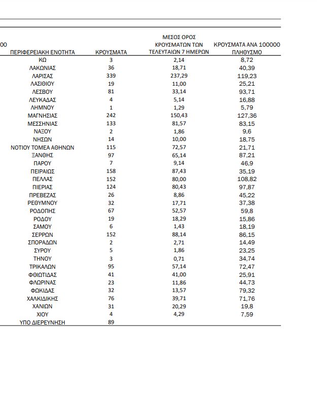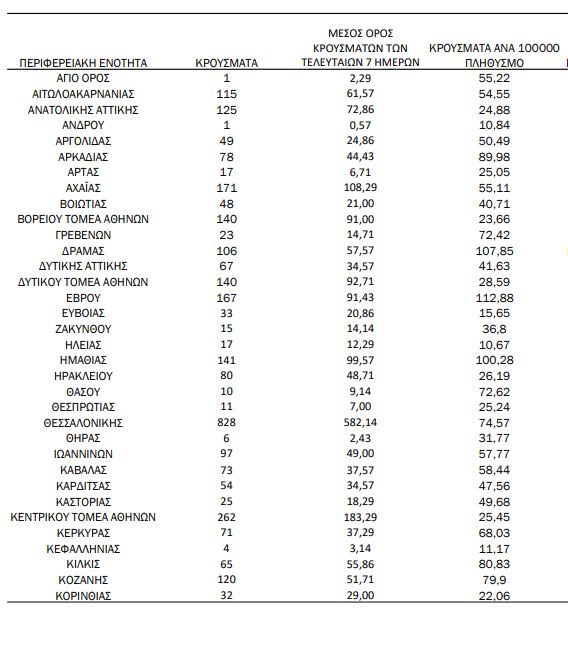 Από την άλλη η Θεσσαλονίκη κατέγραψε 828, ενώ η Θεσσαλία 730 κρούσματα.