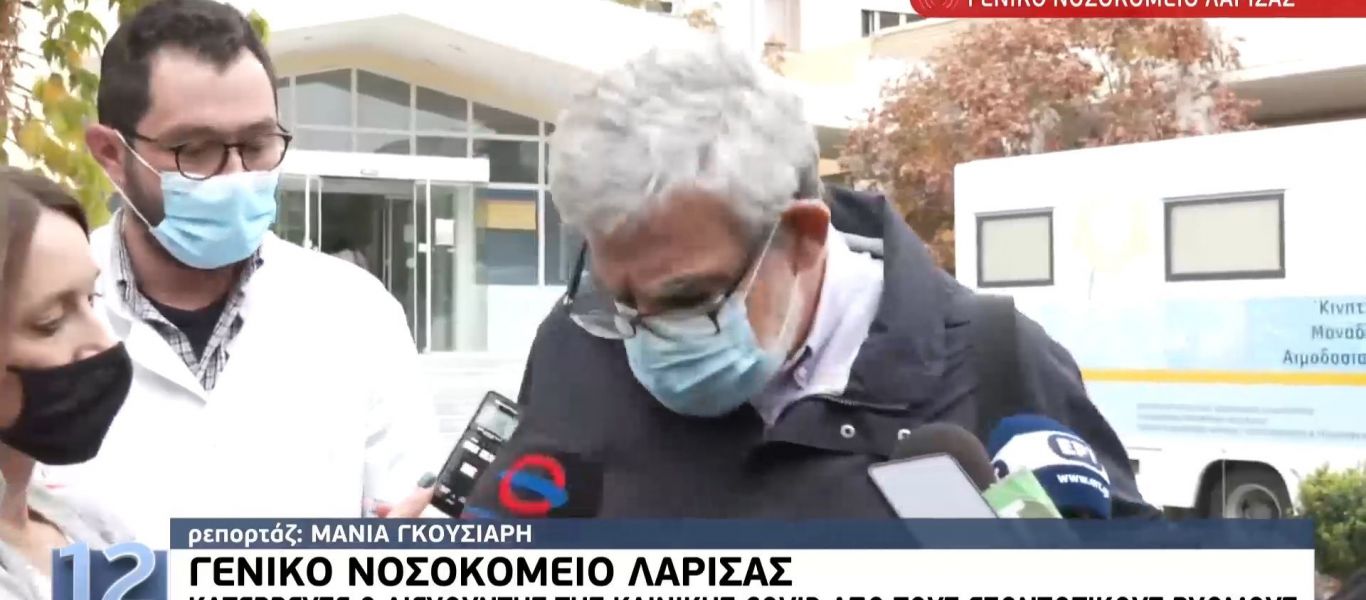Ο Γιάννης Γκαμπράνης, Διευθυντή της Α’ Κλινικής COVID του Γενικού Νοσοκομείου Λάρισας και γραμματέας της ΕΙΝΚΥΛ παρευρέθηκε το πρωί στο προαύλιο του Νοσοκομείου για να ενημερώσει τους δημοσιογράφους, όμως δεν κατάφερε να πει τίποτα περισσότερο εκτός από το ότι να ζητήσει συγγνώμη «από την κούραση».